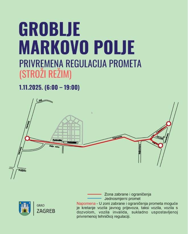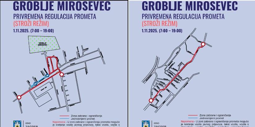 Objavljeni su svi detalji prometne regulacije povodom blagdana Svih svetih. Od subote, 25. listopada do nedjelje, 2. studenoga 2025. godine, temeljem rješenja nadležnog gradskog ureda provodi se privremena regulacija prometa prema gradskim grobljima.