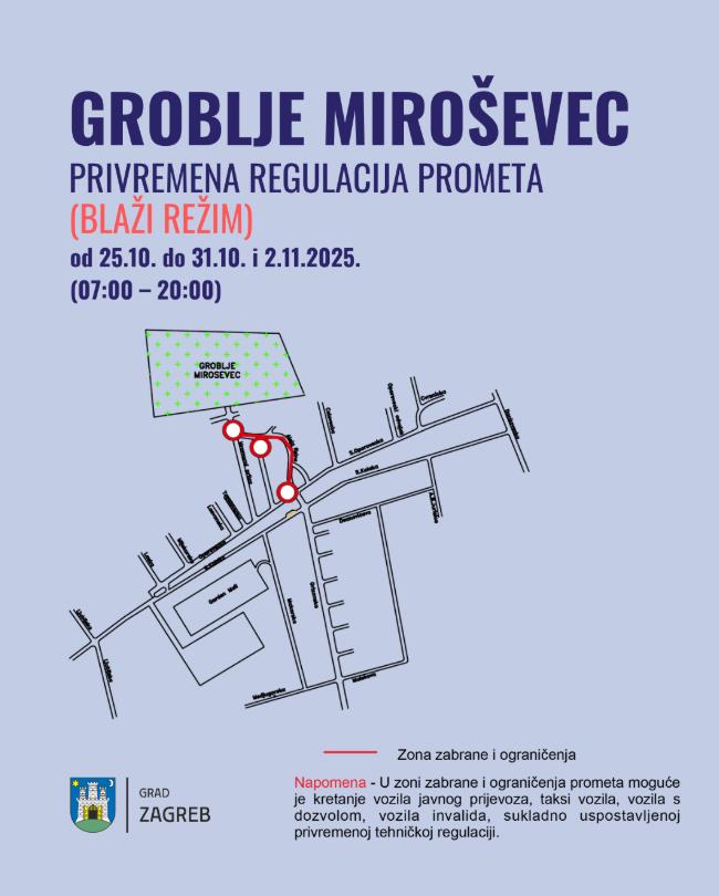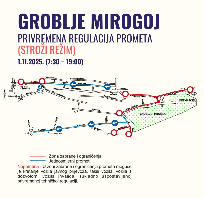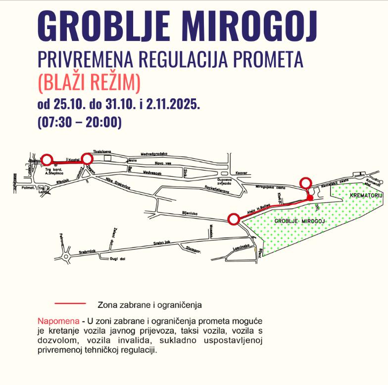 Zabrana prometa Mirogojskom cestom (od Remetske do rotora) i Alejom Hermana Bollea, osim za ZET autobuse, Taxi vozila i vozila s posebnom dozvolom.